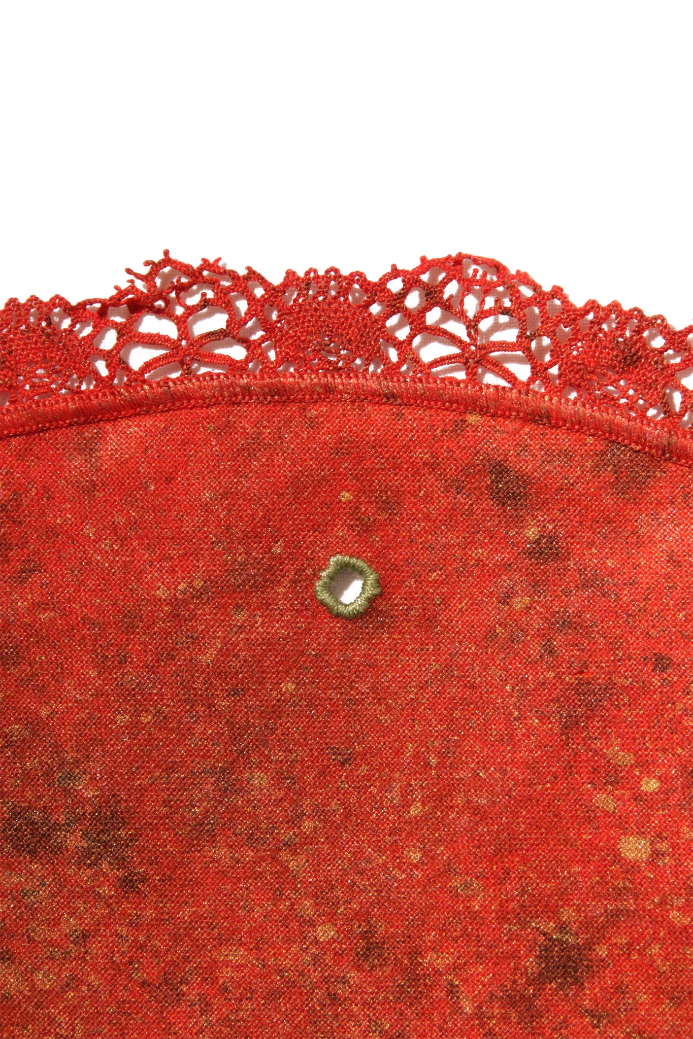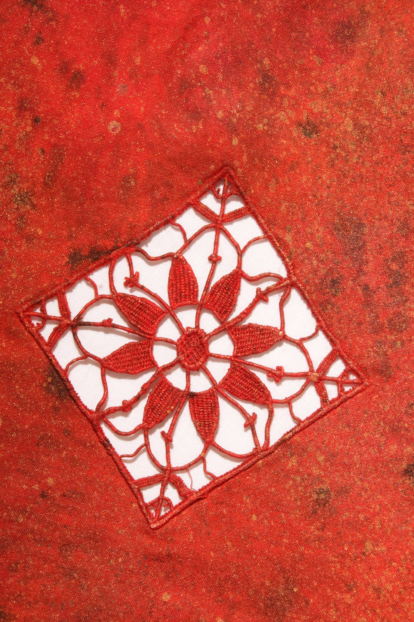 Ce napperon issu de l'économie circulaire est recyclé, teint, peint et brodé.