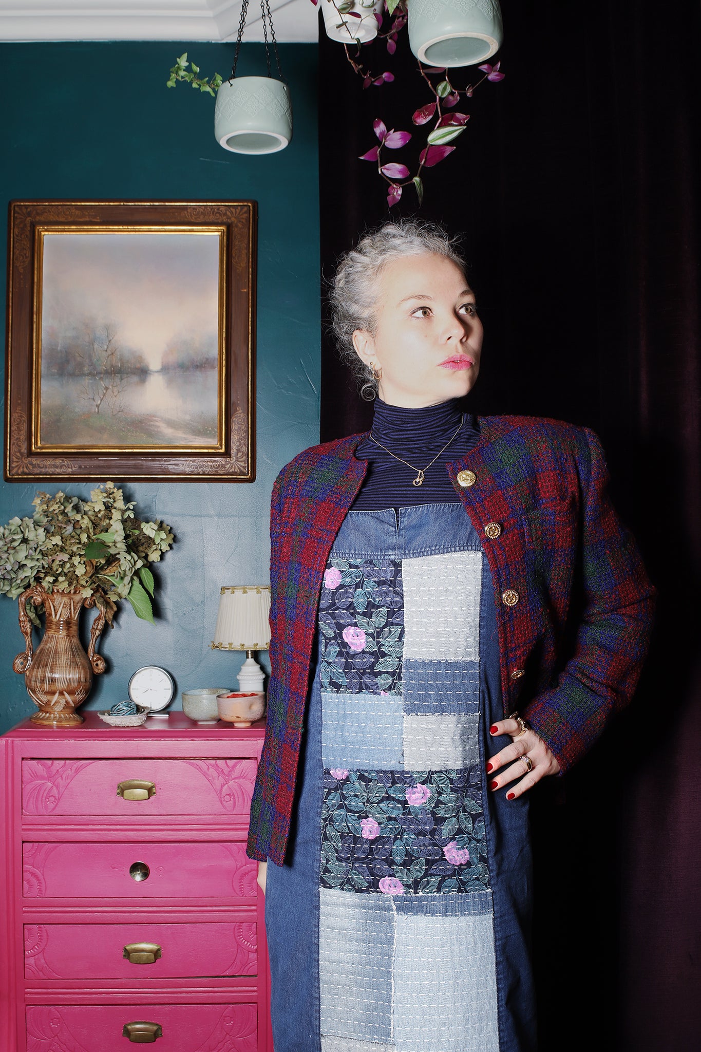 La conception du patchwork a été réalisé avec des chutes de jeans et de tissu. Après l'assemblage chaque élément a été cousu à la main directement sur la robe. Pour une bonne résistance dans le temps, chaque élément de la composition est ensuite fixé à la veste avec une succession de point avant. Cette technique est inspirée de la couture japonaise du Boro. Chaque point est cousu à la main avec un fil en coton blanc.