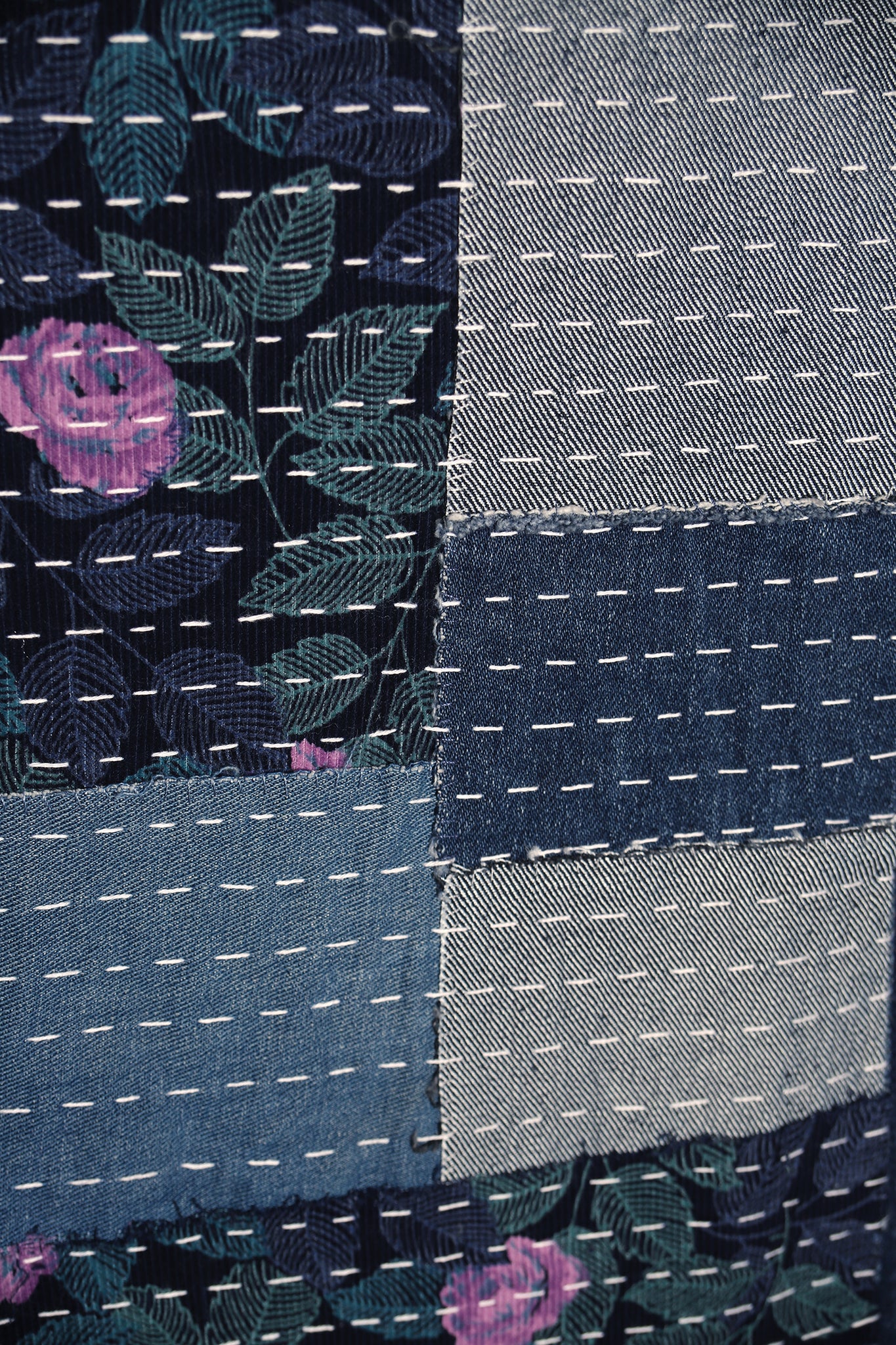 Technique : Le Boro consiste à superposer et coudre des patchs de tissu usé avec des points simples et visibles. La méthode utilise généralement des fils épais et contraste délibérément entre le tissu d'origine et les patchs ajoutés, mettant en valeur le processus de réparation.
